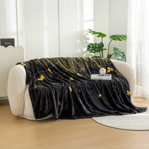 Élvezze a luxusos kényelmet a Mikroplüss takaró VISATA elegáns fekete színével. A stílusos aranyló levelek és pillangók motívuma által nemcsak praktikus, hanem dizájnos kiegészítője is lesz otthonának. A takaró tökéletes pihenéshez a kanapén, az ágyban vagy csodás ágytakaróként a karosszéken.