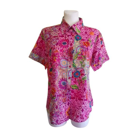 Ez a Milano Donna rózsaszín mintás női rövid ujjú blúz egy csinos, nőies darab, amely kombinálható több stílusú ruhadarabbal, legyen az laza vagy elegánsabb. Rugalmas puha, tiszta pamut anyaga kényelmes viseletté teszi. Jól mutat egy