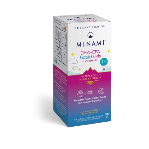 A MINAMI® EPA+DHA Liquid Kids 1+ egy kanalas kiszerelésű, prémium minőségű, rendkívüli tisztaságú, magas omega-3 koncentrációjú étrend-kiegészítő gyermekeknek, amely hozzájárul az agy, a látás, a csont és az immunfunkciók egészséges fejlődéséhez. Felnőtte