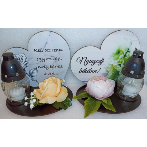 Szív alakú fa dísz talppal. UV nyomtatásos technikával készült, élethű rózsákkal. Mérete: 18 cm magas és 20 cm széles. A mécses tartozék! Az ajándék egyedi, a virágdíszítés eltérhet a képen láthatótól! UV Nyomtatott Fa Szív Talpon Selyemvirá