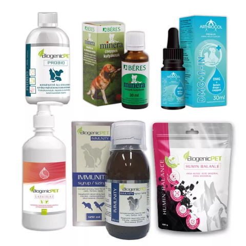 BiogenicPet Humin Balance 100g Kutya táplálékkiegészítők + Biogenicpet Immunity 120 ml BIOGENICIM + BiogenicPet Lazacolaj + BiogenicPet Probio 200ml Kisállat vitaminok és kiegészítő eledelek + Minera csepp kutyának 30 ml + Arthrocol DMG + ß-in 30ml Macska táplálékkiegészítők