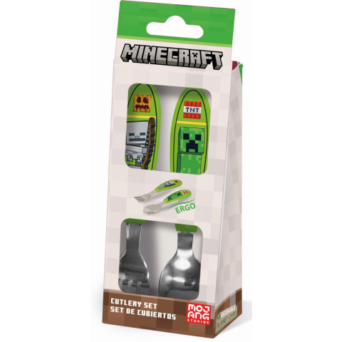 Minecraft fém ergo evőeszköz készlet - 2 darabosFém kanálból és villából álló készlet, amellyel gyermeke a lekerekített formájuknak köszönhetőenszórakoztató és biztonságos módon tanulhatja meg a felnőtt evőeszközök használatát étkezés közben.Nem használható mikrohullámú sütőben, nem tisztítható mosogatógépben.Anyaga: inox és műanyagMéret: 20x7 cm