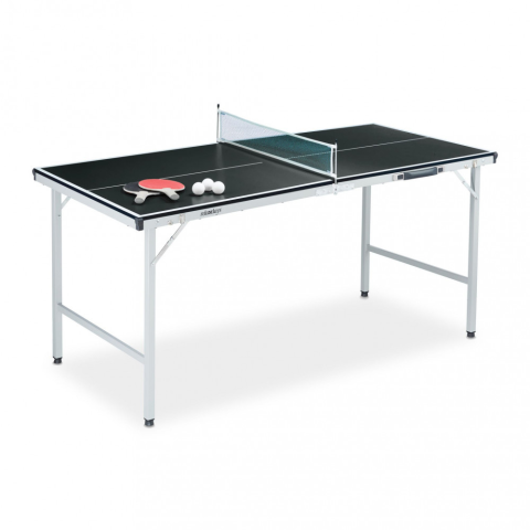 A mini asztalitenisz asztal hálóval, 2 ütővel és 3 labdával ideális otthoni izgalmas mérkőzésekhez. Az asztal kisebb, mint a hagyományos asztalitenisz asztalok, de még mindig van benne elég hely az ütő meglendítéséhez. A 4 állítható magasságú lábának kösz