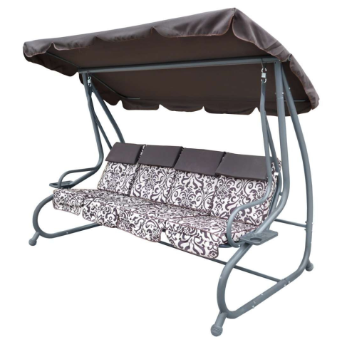 Kertre, teraszra tökéletes hintaágy, barna mintás párnákkal ☀️ Ez a masszív kivitelű hintaágy ideális választás a kertbe vagy a teraszra, ahol kellemesen töltheted el a szabadidődet. A vastag (7 cm) párnákkal kényelmesen ellazulhatsz, miközben a rugó...