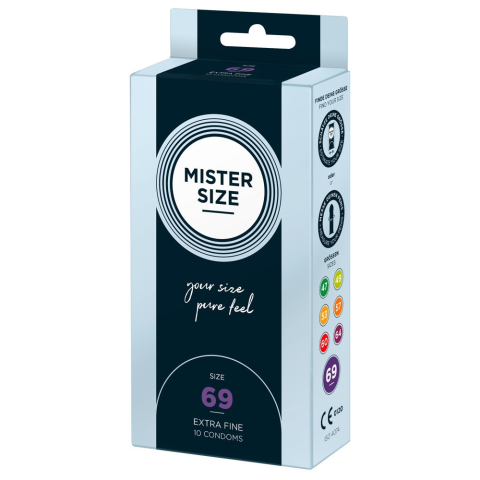 A 69-es méret 15,5-16,5 cm-es péniszkörfogathoz megfelelő. Termék specifikáció: 	szín: áttetsző 	névleges átmérő: 69mm 	extra vékony kialakítás 	spermatartó tartállyal 	síkosítással ellátva 	anyag: természetes gumi (Latex) 	10db óvszer a csomagban Fi