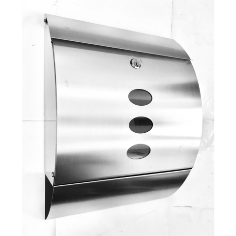Modern - INOX - rozsdamentes acél postaláda - külső nyithatósággal, reklám és ujságtartóval - ívelt ablakos előlap Rozsdamentes acél postaláda, korrózióálló. Anyaga: Rozsdamentes szálcsiszolt acél Szín: INOX ( Saválló gyári szín ) Magasság: 40 cm Széles