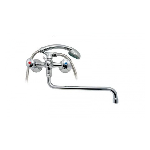 Kád-Mosdó (KMT) fali csaptelep Két gombos kivitel Hagyományos felsőrésszel 1500 mm gégecsővel Zuhanytartó villával Kézizuhannyal Csatlakozás: 1/2 Vízátbocsátás: 20,5 l/min Perlátor mérete: M 22*1