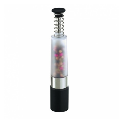 Ennek a kis borsőrlőnek minden asztalon ott a helye. Elegendő a tetején lévő rúgós gombot megnyomni és máris ízlés szerint fűszerezheti ételeit. Rozsdamentes acélból és acrylból készült, a daráló szerkezete pedig kerámiából van. A daráló magassága kb. 15