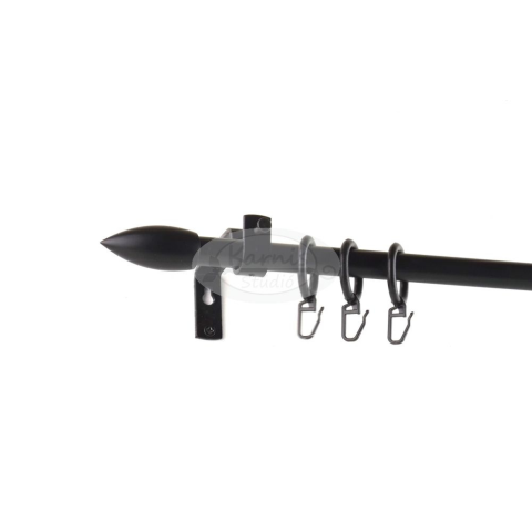 A MOHÁCS fekete 300 cm-es 1 rudas fém karnis szett tartalma: 1 db 300 cm-es fekete fém karnisrúd 2 db Mohács típusú fekete fém végzáró 3 db falra szerelhető fém konzol a felszereléshez szükséges tiplik és csavarok 30 db fekete műanyag karika fekete szín