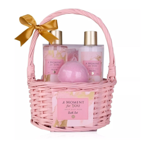 MOMENT FOR YOU fürdőkészlet ajándékkosárban 6055860 MOMENT FOR YOU fürdőkészlet ajándékkosárban 6055860 Tartalma: 140 ml tusfürdő 140 ml testápoló 100 g pezsgőfürdő golyó 15 g hálós fürdőszivacs Illat: Gold Dust Rose Szín: rózsaszín/arany Csomagolási
