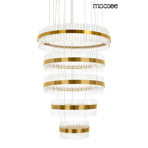 MOOSEE GHIA 5 Függőlámpa: Luxus fényár a nappaliban ✨ Ez a lenyűgöző függőlámpa 5 elegáns, arany színűre fényezett acélgyűrűből és átlátszó üveg árnyékolókból áll, melyek kaszkádszerűen lógnak. A különböző méretű körök modern és gyönyörű dizájnt köl...