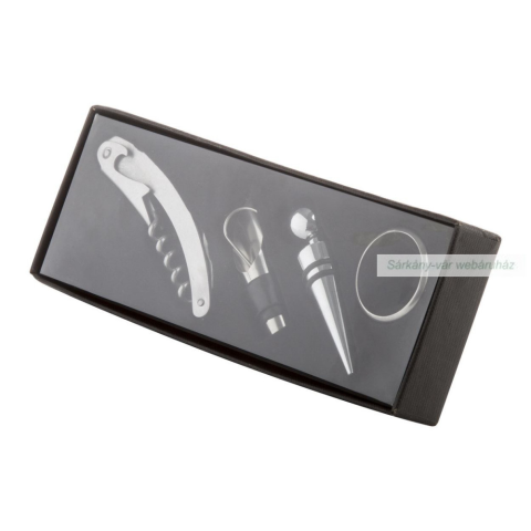 4 részes boros szett,mely dugóhúzót,cseppőrt,dugót és kiöntőt tartalmaz. Fekete díszdobozban szállítjuk. Méret:223×80×30 mm Emblémázási adatok: Max. méret:60mm x 60mm Rendelésre: 3-10 nap!!