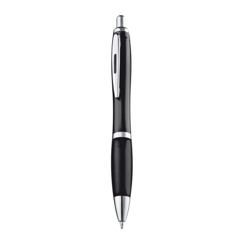 Műanyag golyóstoll, színes tolltesttel és króm kiegészítőkkel. A toll nyomógombos szerkezettel, színes csúszásgátló fogórésszel és nagyméretű kék tollbetéttel van ellátva