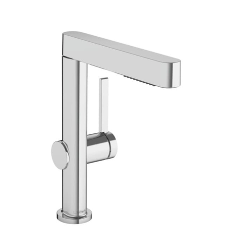 Karral álló mosdó csaptelep kihúzható zuhannyal, 2 áram. Króm kivitelben. A csaptelep térfogatárama 5 liter / perc. A csaptelep magassága 25,8 cm. A kar 22,9 cm magasan van.