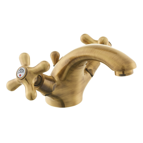 Csappal állványos mosdó csaptelep leeresztőszeleppel. Retro kivitelben. Bronz kivitelben. A kar 7 cm magasan van.