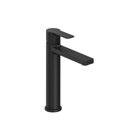 Karos mosdókagyló-keverő kifolyó nélkül, fekete színben. Az átfolyási sebesség 3,5 liter/perc. A keverő magassága 23 cm. A kar 16,8 cm magas. Matt kivitelben.