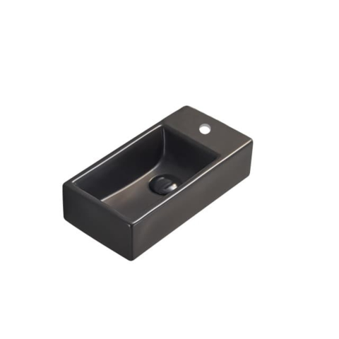 Fekete falra szerelhető mosdó 40,5 cm széles, 20,5 cm mély és 10,5 cm magas. A kifolyó nem tartozéka a szállításnak.