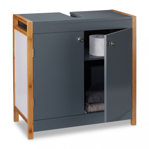 Ezzel a szekrénnyel optimálisan kihasználhatja a mosdókagyló alatti teret, és új stilussal bővítheti a fürdőszobát vagy a konyhát. A keret természetes bambusz tökéletesen kiegészíti a szürkére lakkozott MDF-et. 2 rekesz áll rendelkezésre tisztítószerek, t