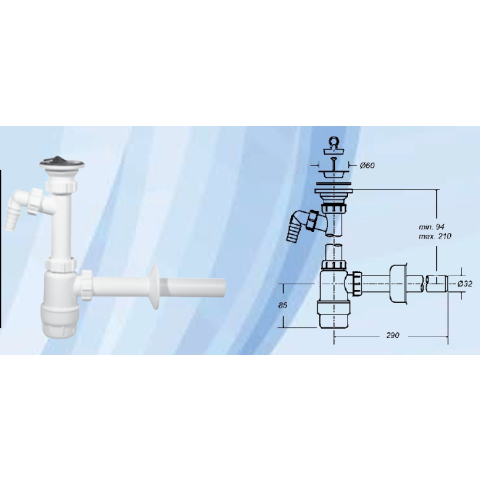 1 kép Mosdószifon mosógép csatlakozóval, leeresztővel, 32mm átm. elfolyással (Mosdószifon mosógép)