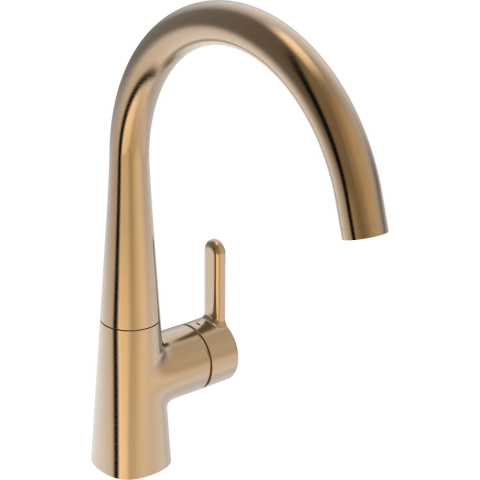 Karral álló mosogató csaptelep elforgatható kifolyóval csiszolt bronzban. A csaptelep térfogatárama 12 liter / perc. A csaptelep magassága 34,8 cm. A kar 23,9 cm magasan van. Matt felülettel.