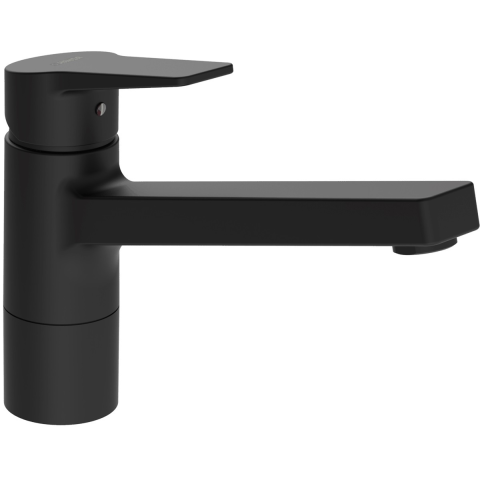 Karral állványos mosogató csaptelep forgó karral. Fekete színben. A csaptelep térfogatárama 12 liter / perc. Matt felülettel.