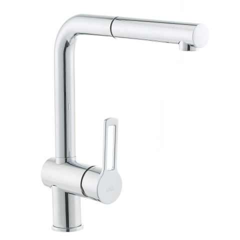 Karral állványos mosogató csaptelep kihúzható zuhannyal. Kerekített kivitelben. Króm kivitelben. A kar 25,4 cm magasan van.