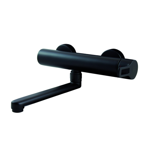 Karral fali mosogató csaptelep leeresztőszelep nélkül. Kerekített kivitelben. Fekete színben. A csaptelepek távolsága 150 mm. Matt felülettel.