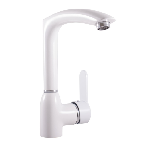 Karral állványos mosogató csaptelep forgó karral. Fehér színben.