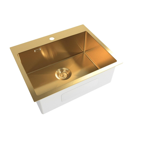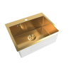 Rozsdamentes acél egyszemélyes mosogató arany kivitelben, 55x45 cm méretű és 21 cm mély munkalapra szerelhető.