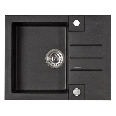 Gránit egymedencés mosogató lecsepegtetővel, fekete, 59x47 cm méretű és 18 cm mély munkalapra szerelhető. 50 cm széles szekrénybe szerelhető.