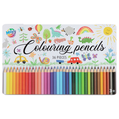 Fém tárolódobozba helyezett 36 db-os színes ceruza készlet, amely élénk és pasztell színeket is tartalmaz.Alkalmas 3 éves kortól.Márka: Grafix/Moxy