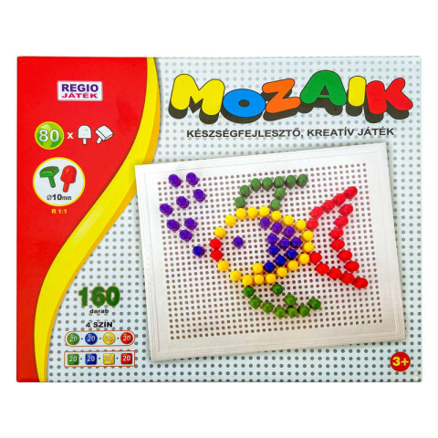 Készíts szépséges mozaikképeket a színes pöckök segítségével! A Mozaik M10-160db kreatív játékkal kellemes kikapcsolódásban lesz részed. A pici lyukakból álló táblára különféle pöcköket illeszthetsz fel, ezzel csodálatos mintákat alkotva. A játékban 160 darab mozaik elemet találsz, ami 2 különböző formával és 4 féle színnel rendelkezik. Zöld, kék, piros és sárga pöckök biztosan könnyedén meg fognak ihletni vidám rajzok elkészítésére. A játék