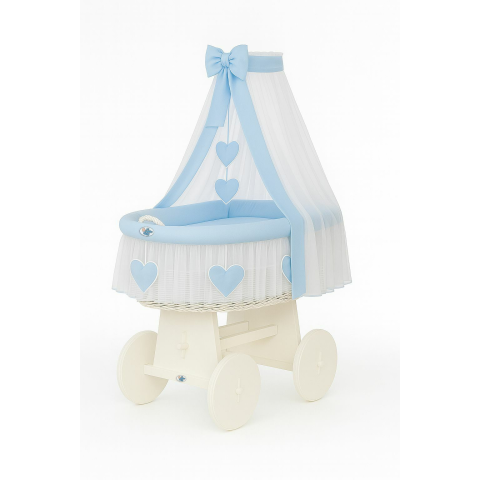 1 kép Mózeskosár fonott függönyös kiságy Amelie - fehér + kék ágyneműhuzat