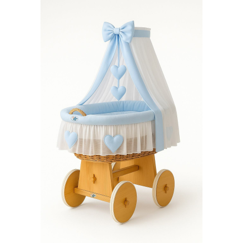 Amelie Kék Mózeskosár Baldachinnal - Prémium Kényelem és Biztonság Babádnak 💙 Ez a gyönyörű, kézzel szőtt mózeskosár tökéletes választás újszülött babád számára, biztosítva a pihentető és biztonságos alvást. A nagyméretű fa váznak és a strapabíró ker...