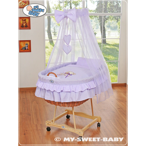 1 kép Mózeskosár/Fonott függönyös rácsos kiságy - Maci lila masnival