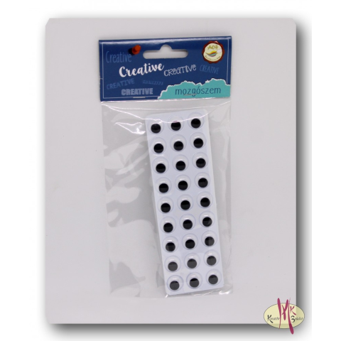Kör alakú, fekete-fehér mozgó szemek. Öntapadós! Több méretben kapható. Méretek és mennyiség: 6 mm: 150 db/csomag 8 mm: 104 db/csomag 10 mm: 66 db/csomag 12 mm: 54 db/csomag