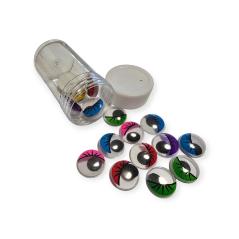 Jellemzői: Öntapadó, kör alakú, színes mozgószemek, szempillás. Méret: 15 mm Vegyes színek.