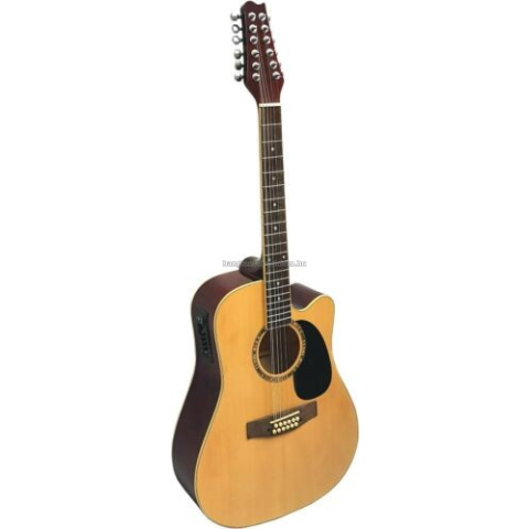 12 húros westerngitár EQ-val Szín: natúr MÉRETE MIATT CSOMAGAUTOMATÁBA NEM RENDELHETŐ! Cutaway test Fedőlap: 4 részes lucfenyő funér Test: hársfa Fekete koptató, pick guard Fogólap és híd Blackwood Celluloid berakások 20 bund Fényes polírozás EQ hang