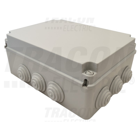 Tracon, TQBY312313, műanyag falon kivüli kötődoboz 310x230x130 lépcsős gumi átvezétővel IP65 világosszürke (Tracon TQBY312313)Szerelési mód: fali/mennyezeti szerelés Hosszúság: 310 mm Szélesség: 230 mm Mélység: 130 mm Bevezetések száma: 12 Szekrényátvezet