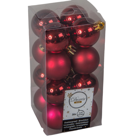 Elegáns, bordó színű karácsonyfadísz gömbök, klasszikus fényes és matt kivitelben, egyaránt tökéletesek a modern és a hagyományos ünnepi dekorációhoz. A 4 cm átmérőjű gömbök törhetetlen műanyagból készültek, így biztonságos választás gyerekes családok és