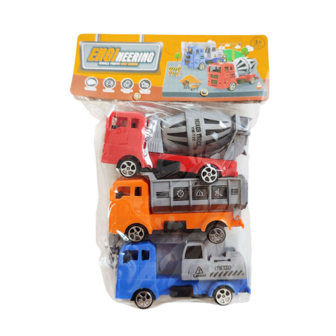 Egy betonkeverő kamiont, egy emelő daruval ellátott kamiont és egy billencses teherautót tartalmazó autó szett. Ez a szett 3 db különböző munkagépes járművet tartalmaz. Egy betonkeverő kamiont, egy emelő daruval ellátott kamiont és egy billencses teher