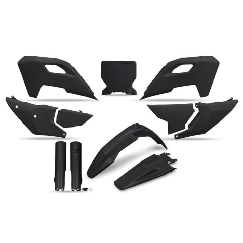 Teljes Karosszéria Készlet Villavédőkkel Husqvarna TC / FC 2023 után UFO FeketeTeljes műanyag készlet az UFO-tól, kiváló minőségű műanyagból, az eredeti burkolat helyettesítésére. A burkolati elemek tökéletesen illeszkednek, és gyorsan, egyszerűen rögzíth