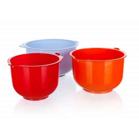 A 17 / 19 / 22 cm átmérőjű és 12,5 cm magas keverőtál készlet mindenféle ételek készítése során kihasználható. A tál szettek különböző vegyes színekben kerülnek szállításra - piros, kék, narancssárga.