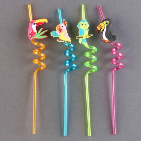 Műanyag Spirális Szívószál – Papagájokkal, 4 db-os
