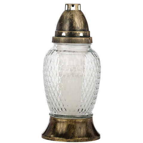Műanyag tetős üvegmécses 25 cm x 11 cm méretű, sírra helyezve kegyeleti célokra, szeretteinkre való megemlékezésre használható.