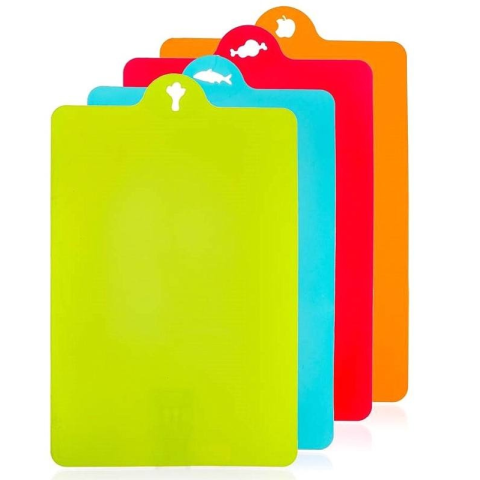A vágódeszkák műanyagból készülnek és piros, narancssárga, zöld és kék színben kaphatók.