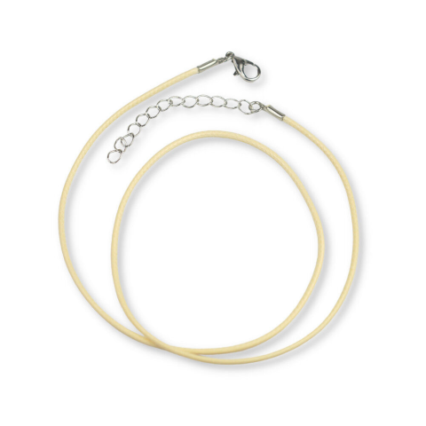 Vanília színű műbőr nyaklánc ezüst színű kapoccsal - 50 cm 🔗 Készítsd el egyedi medáljaidat és dobd fel őket ezzel a stílusos vanília színű műbőr nyaklánccal! A lánc biztonságos, ezüst színű fém kapoccsal záródik. Főbb jellemzők: Szín: Vanília Any...