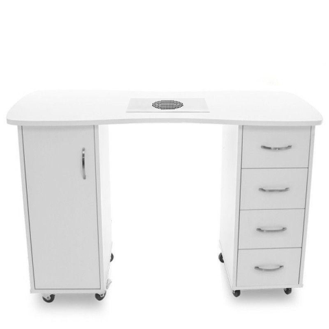 Műkörmös asztal fehér színben! Az asztalban 4 fiók, ajtós részében 1-1 polc található. Az asztal görgővel rendelkezik, valamint porelszívó is tartozik az asztalhoz. Méretek: Magassága: 80 cm Szélessége:121 cm Mélysége (a vendég és a szakember közötti t