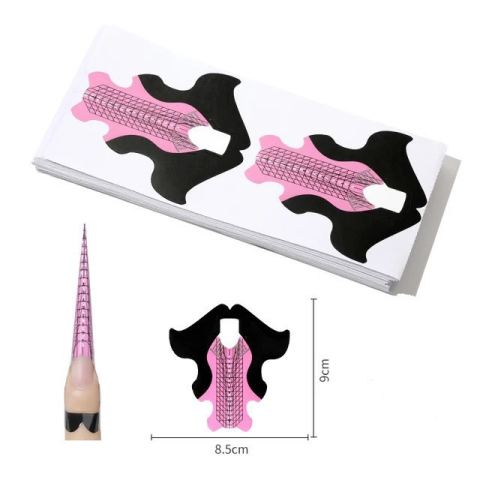 Épített zselés, vagy épített porcelános technikánál tudod használni ezt az öntapadós papír műköröm sablonokat. Ha szükséges felragasztás előtt ollóval tudod alakítani a papír sablon formáját. Keskeny sablonokat a rövidebb műkörmökhöz, a széles sablonoka