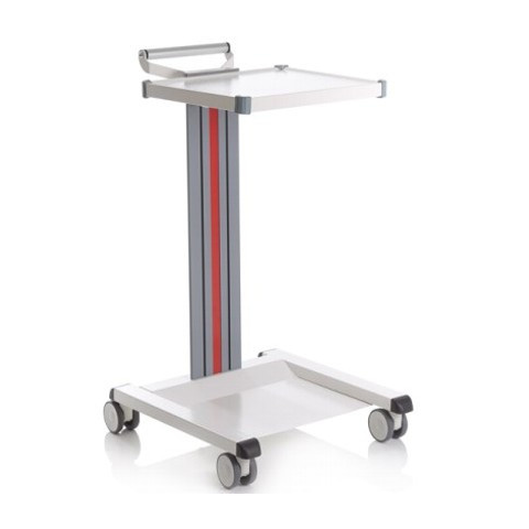 Termék jellemzői: Teljes magasság 80 cm, polc mérete: 35x40 cm. - Kocsik talppal, polccal és fogantyúval, fehér porszórt acélból. - Oszlop alumíniumból, - testreszabható 1 db 8 színes csík (2 színenként: kék, piros, sárga és zöld) - Első kerekek Ø 75 mm,